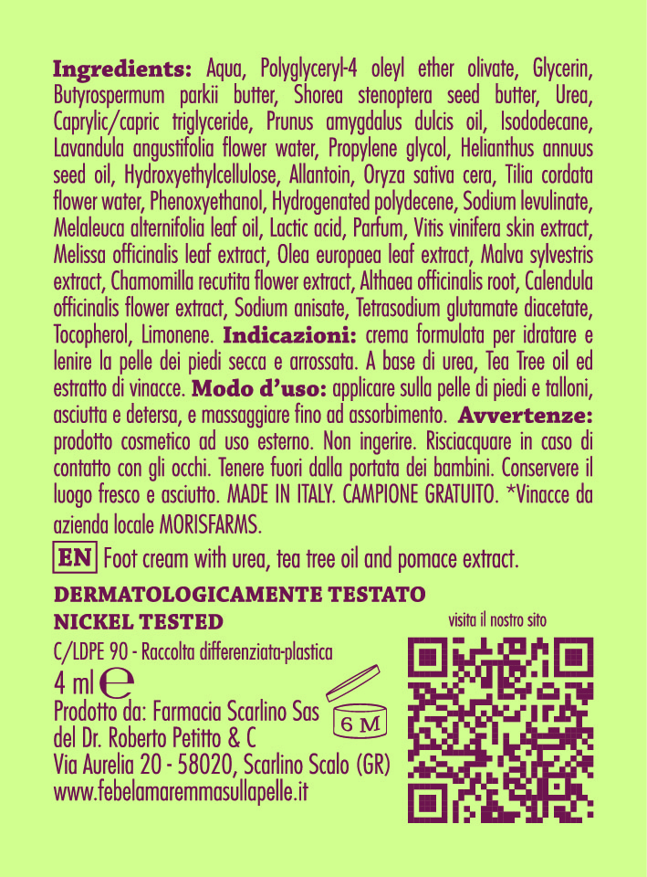 Crema piedi dalla consistenza leggera. Idrata e lenisce la pelle dei piedi secchi e arrossati. A base di urea, ad azione cheratolitica per togliere gli strati di pelle secca e favorire il rinnovamento cellulare; Tea Tree Oil, dalle note proprietà antisettiche e antimicotiche; estratto di vinacce*, altamente antiossidanti e ricche di acidi grassi. Un fitocomposto di origine naturale, coadiuvato dalla presenza di allantoina, rende questa crema estremamente lenitiva e disarrosante.