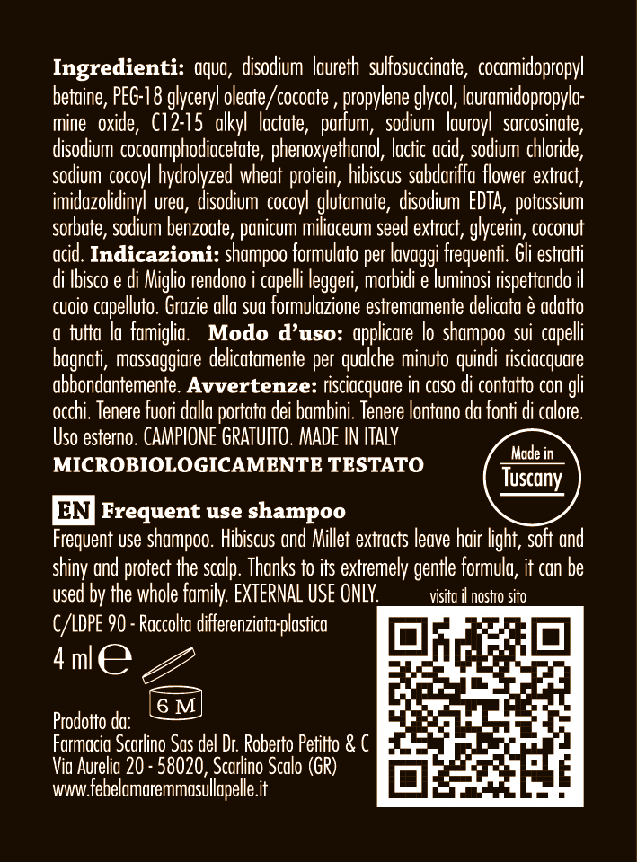 Frequent use shampoo. Hibiscus and Millet extracts leave hair light, soft and shiny and protect the scalp. Thanks to its extremely gentle formula, it can be used by the whole family. Gentle scent and velvety texture.